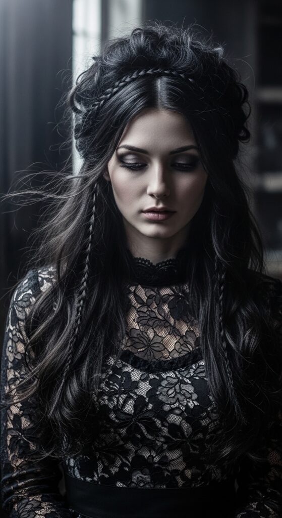 Take two small braids from each side and pin them at the back like a crown. Let the rest of your hair fall in soft waves. This is romantic goth hairstyles energy — but soft enough for a wedding.
