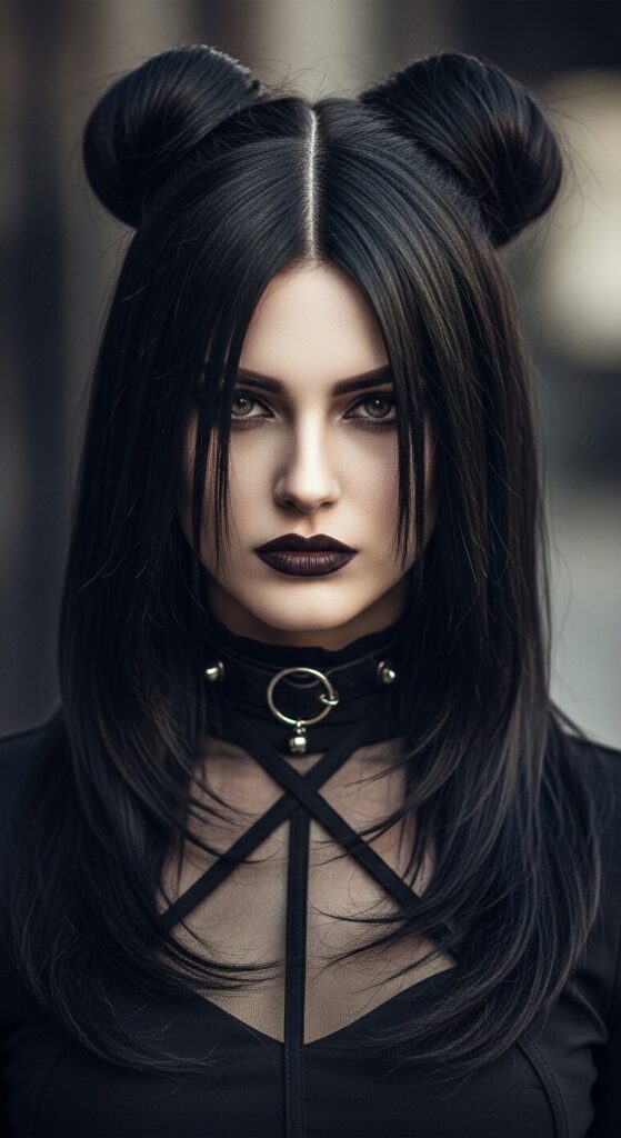 The vampire haircut is all about sharp, face-framing layers. For a half up version, pull the top section into two tiny space buns. It keeps the edge of the layers visible.