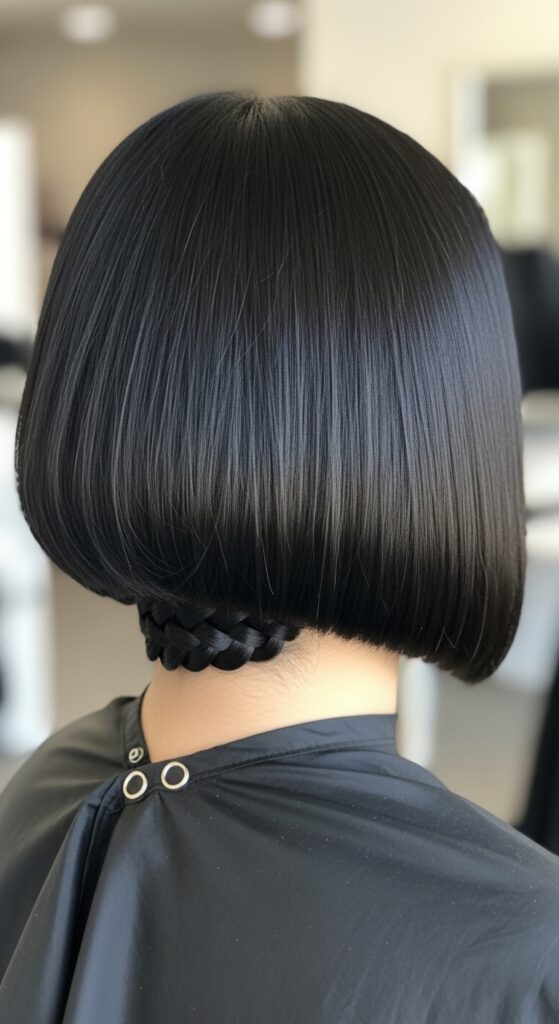 Now, gently fold the braid under itself, tucking the elastic up and hiding it behind the unbraided hair. Pin it in place from underneath. The braid creates a solid, weighted “end” that mimics a perfect blunt cut when you look in the mirror.