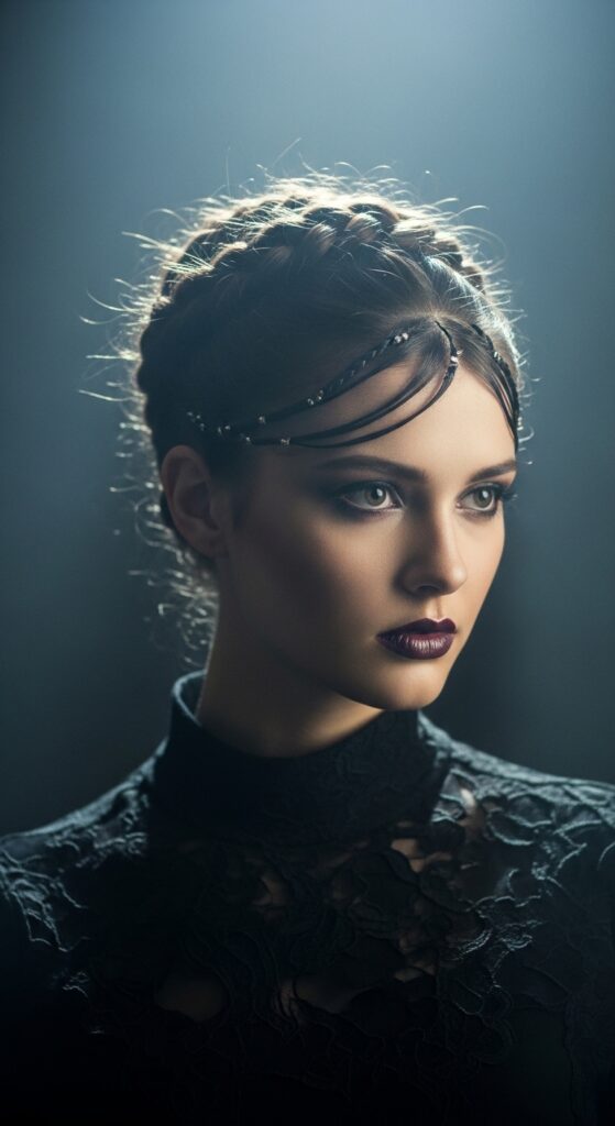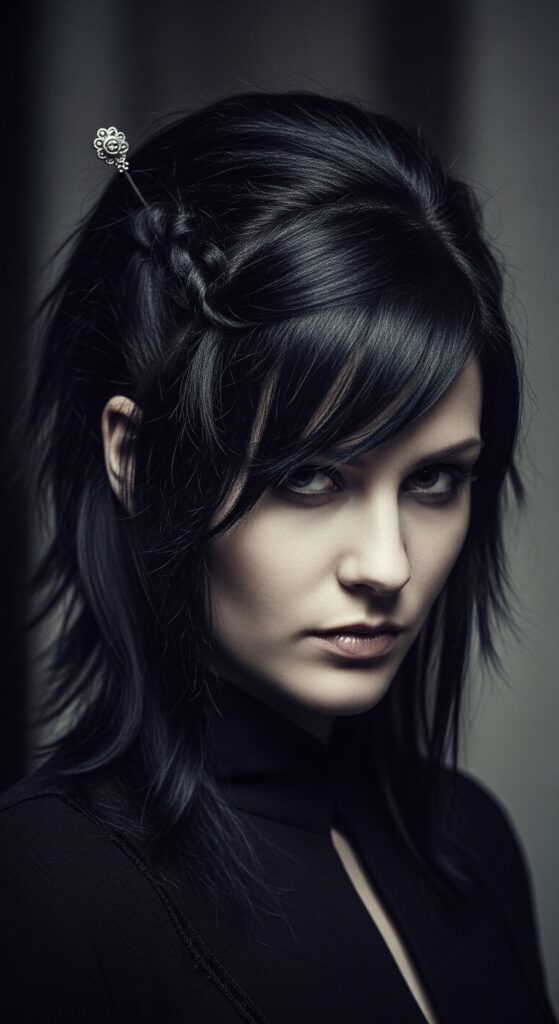 This style mixes delicate and dark for a stunning romantic goth hairstyles look. It’s easier than it appears and keeps hair completely off your face. It works on all hair lengths, especially with some texturizing spray for grip.