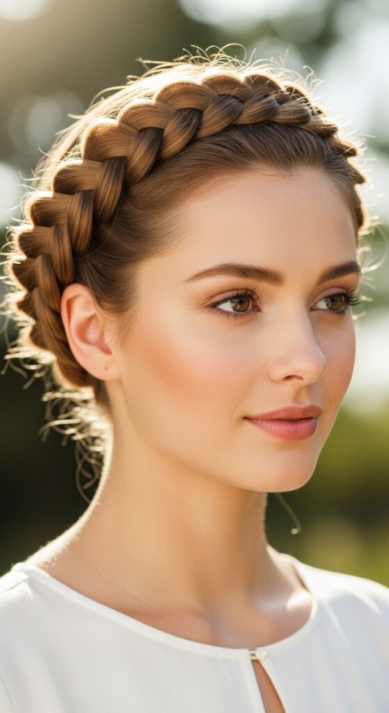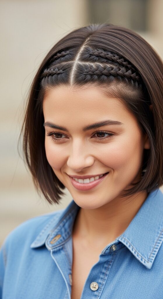 If you have a bob, pixie, or growing-out layers, this style adds a feminine touch. It uses a tiny braid as a functional and decorative headband, keeping shorter pieces in place beautifully.
