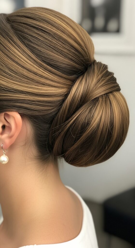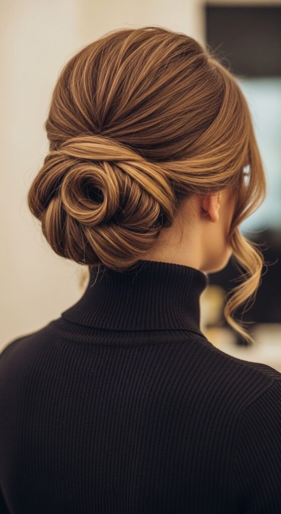 This classic updo seems tricky but is totally achievable on medium-length hair with a little practice. It’s the epitome of quiet luxury and old money hair elegance, perfect for dinners or a day at the office.
