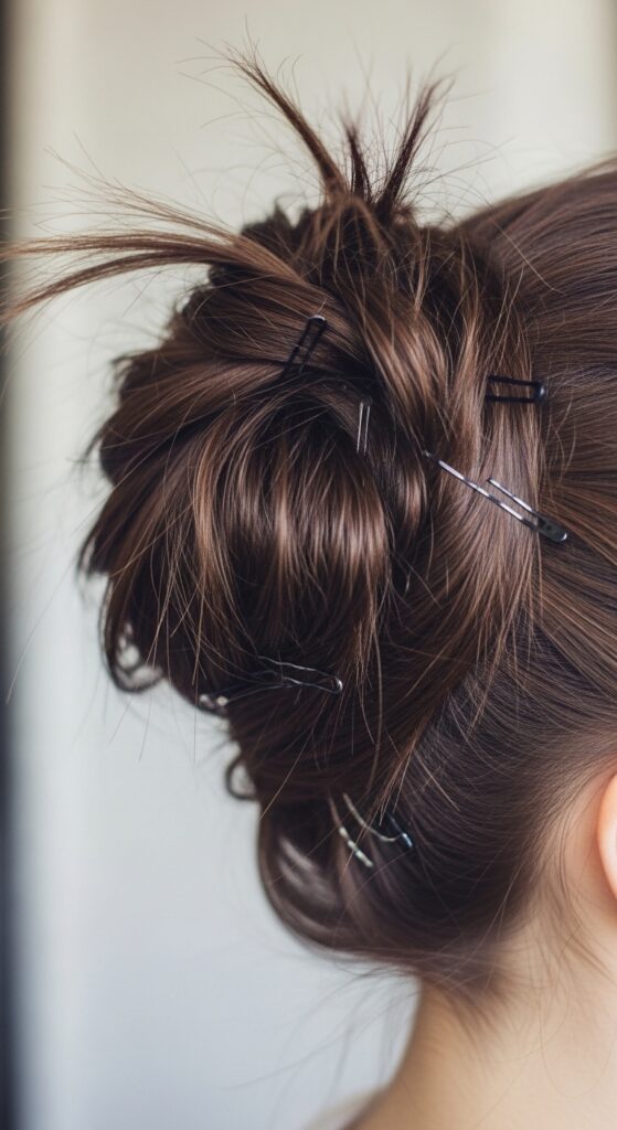 Gather the top half of your hair as if for a half-up style. Instead of making a ponytail, twist the section once or twice at the back of your crown. Then, coil the twist into a small, messy bun and secure it with bobby pins.