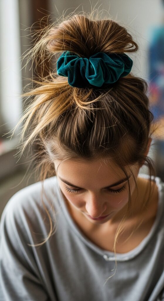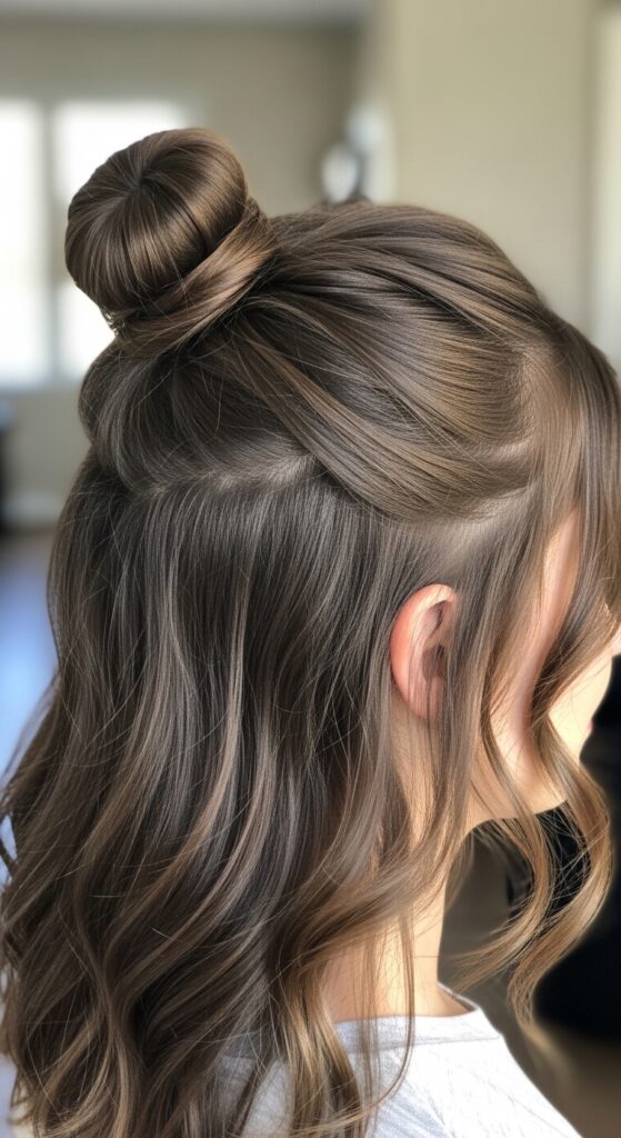 Don’t make it too tight or neat. Pull out a few pieces from the bun and around your face to soften it. Let the bottom half of your hair flow freely. It’s a simple upgrade from a basic half-up look.