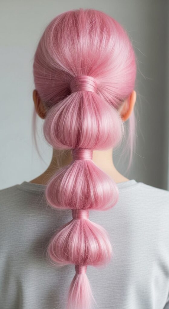 Pull your hair into a high, mid, or low ponytail and secure it tightly with an elastic. Move down about 3-4 inches and place another elastic. Gently puff out the section of hair between the two elastics to create a “bubble.”