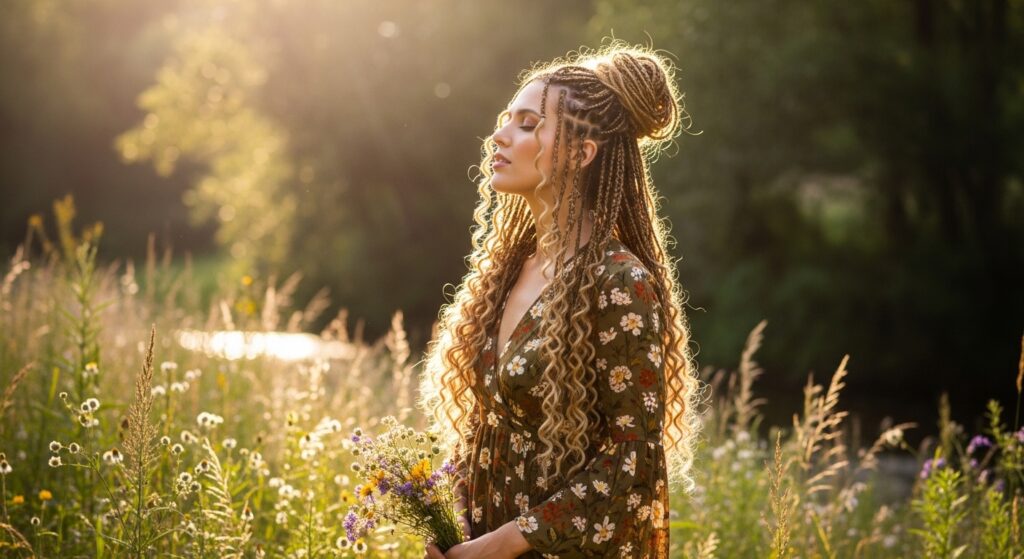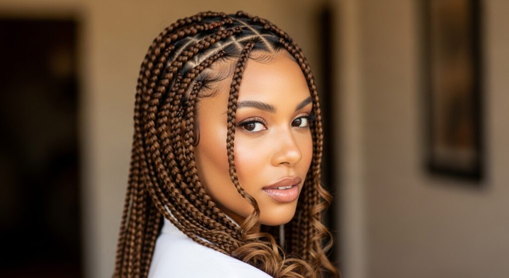 2. Side-Swept Goddess Flow: All braids are swept dramatically over one shoulder. This style frames the face beautifully and emphasizes the length and texture of the released hair.