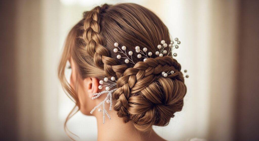 12. Tucked Braids with Beaded Ends: Braids are tucked under themselves at the back into an elegant roll or fold, with the ends—adorned with gold cuffs or beads—left visible alongside curls.