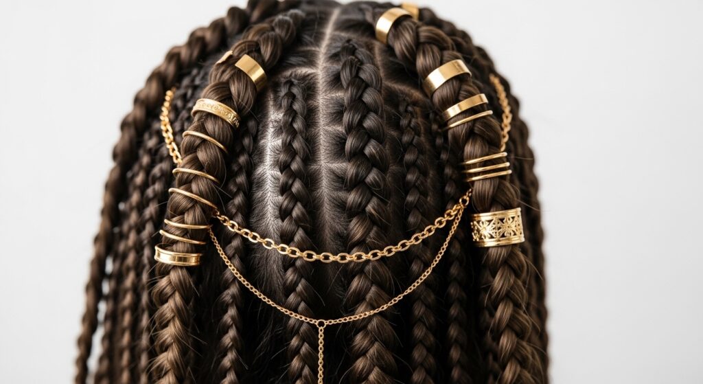 17. Gold Cuff & Ring Cascade: Slide matte or shiny gold cuffs and small rings onto several braids at varying intervals for a luxurious, metallic detail.