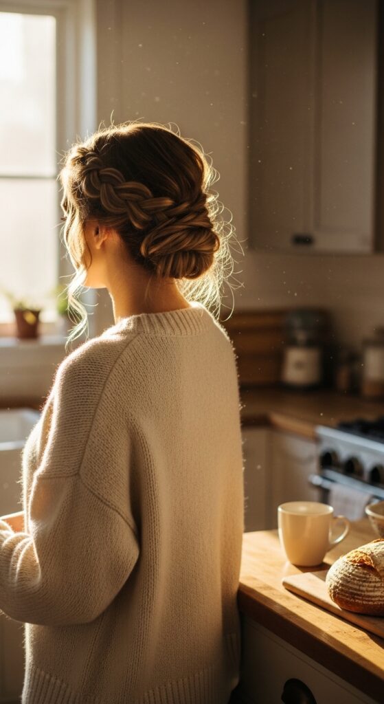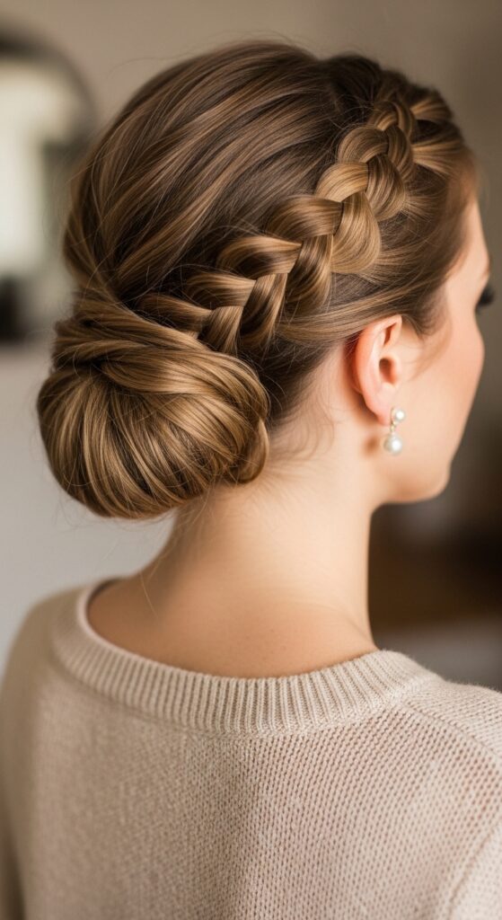 This one is my go-to when I want to look polished without trying too hard. Braid your hair from the crown to the nape, then gather the remaining hair into a loose bun. Pull out a few face-framing strands to soften the whole thing.