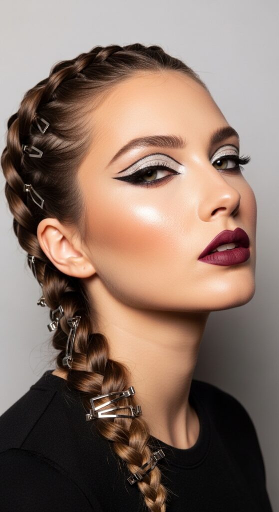 Glitchy glam hair is all about unexpected details. Think metallic clips, asymmetrical braids, or a braid that starts then stops abruptly. French braid a small section near your temple and let the rest of your hair stay sleek.