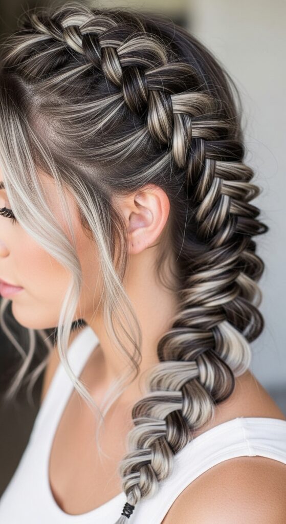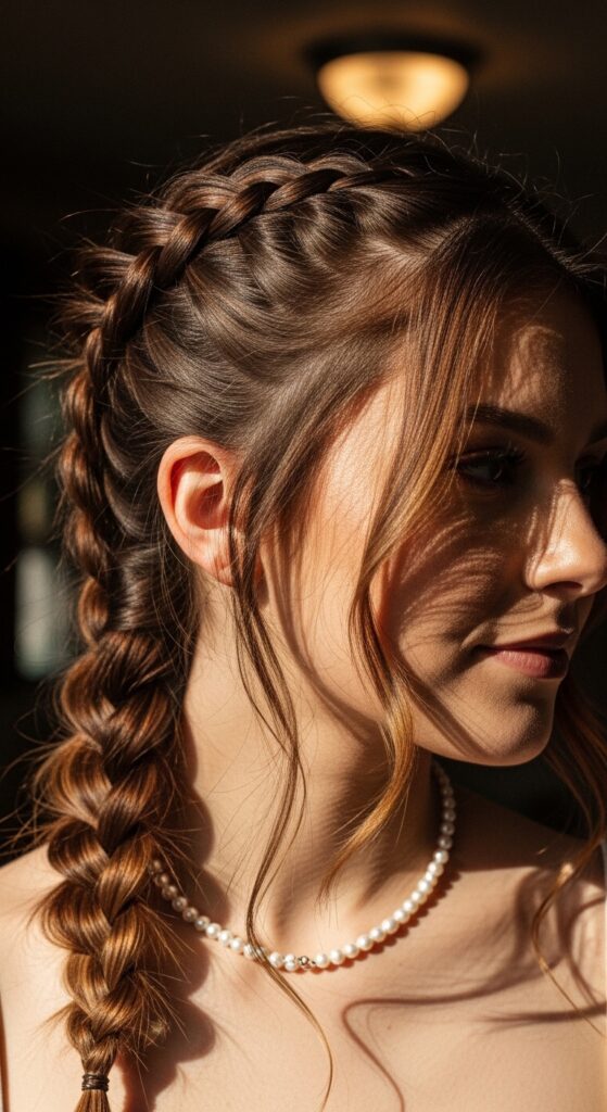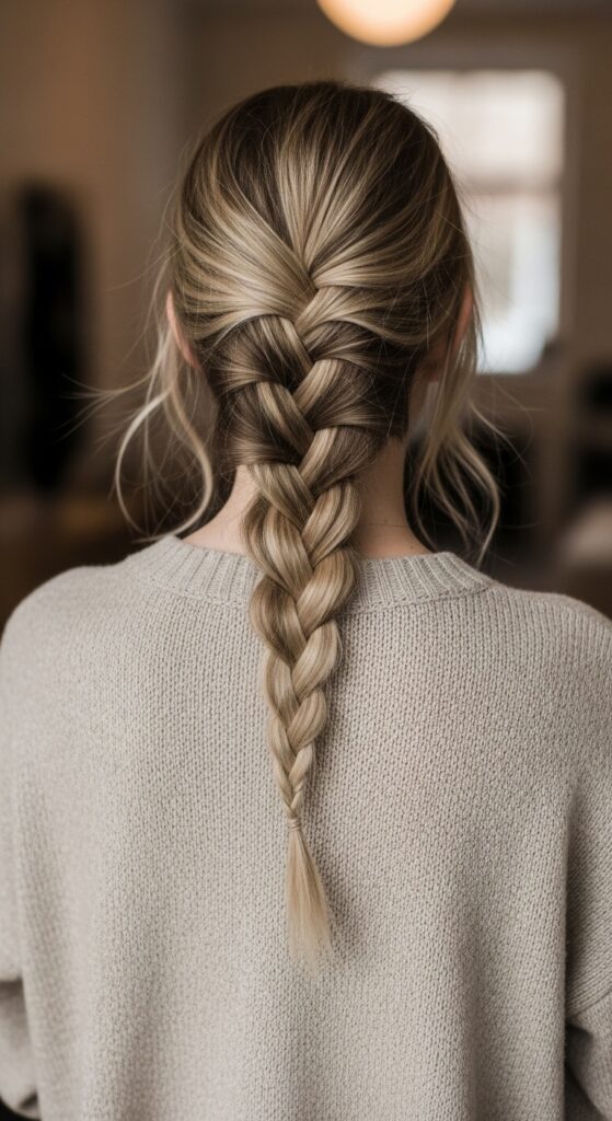 If you have highlights, a French braid shows them off beautifully. The braid creates depth as the lighter strands weave through darker ones. Baby lights look especially delicate.