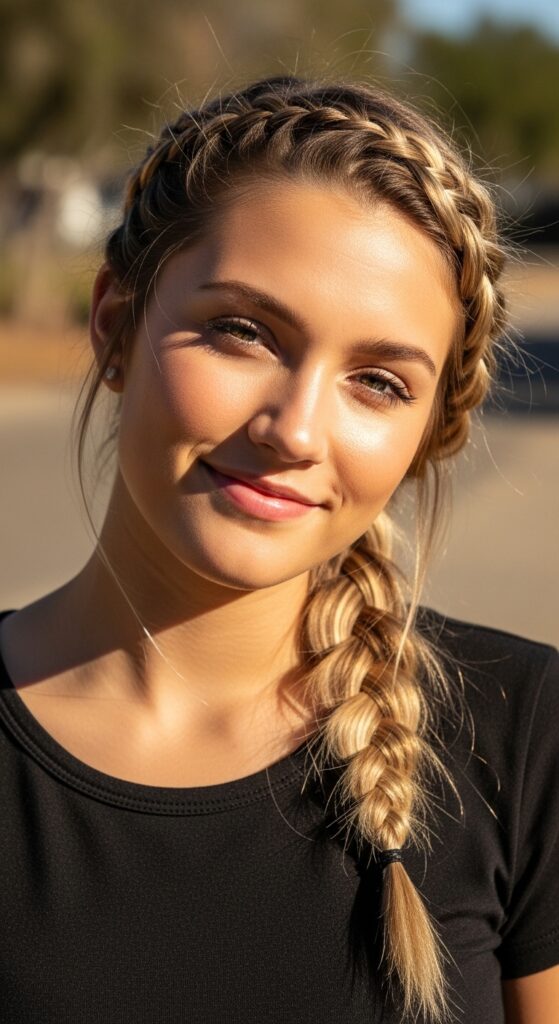 Start with a high slicked-back ponytail, then French braid the tail. It’s a modern twist that feels fresh and sporty. Perfect for when you want your hair completely out of your face.