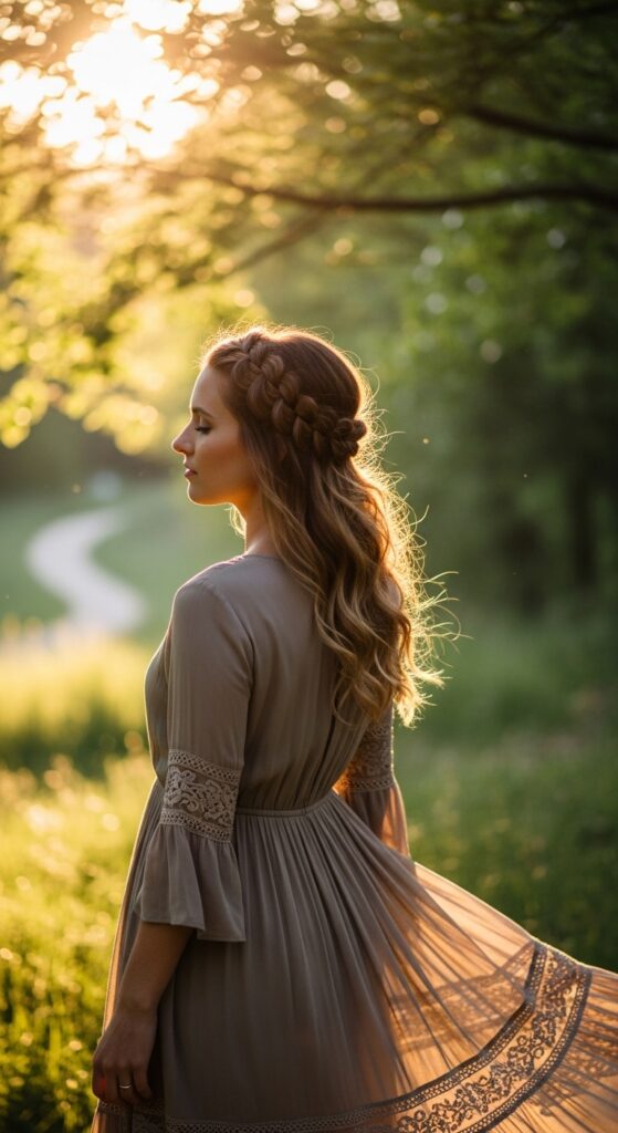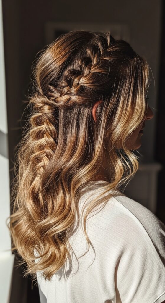 Braid from the crown to mid-length, then let the rest of your hair fall in curls. You get the structure of a braid on top with softness below. It’s the best of both worlds.
