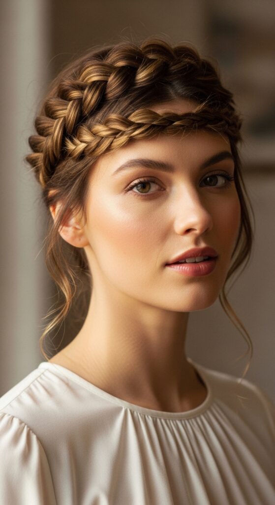 Take a thin section from behind your ear, braid it, and pin it across the top of your head like a headband. It looks intricate but takes under five minutes. Great for bad hair days or when you want a hair accessory without buying one.