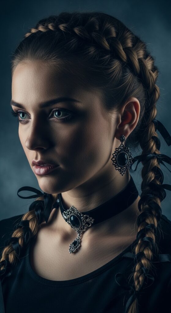 Thread a ribbon through your braid as you go. It’s a small detail that makes the whole look feel intentional. Black ribbon works for romantic goth hairstyles, while pastel ribbons feel soft and sweet.