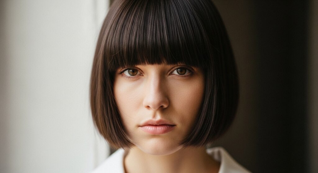 16. Full, Straight-Across Bangs: A bold, thick fringe creates a strong horizontal line at the top of your face, setting a wider frame from the start.