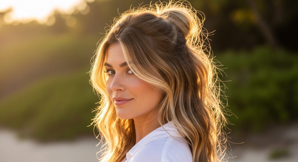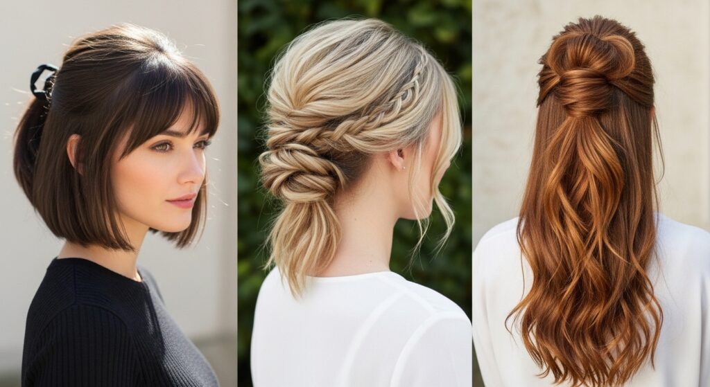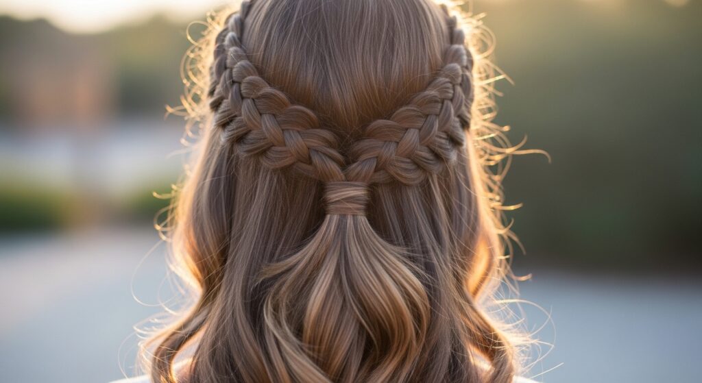 The Dutch Braid Half-Up Crown: Create two Dutch braids (reverse French braids) starting at your temples, following your hairline back to the crown. Secure them together into a half-ponytail. This regal style works on every hair length, creating a beautiful crown effect.