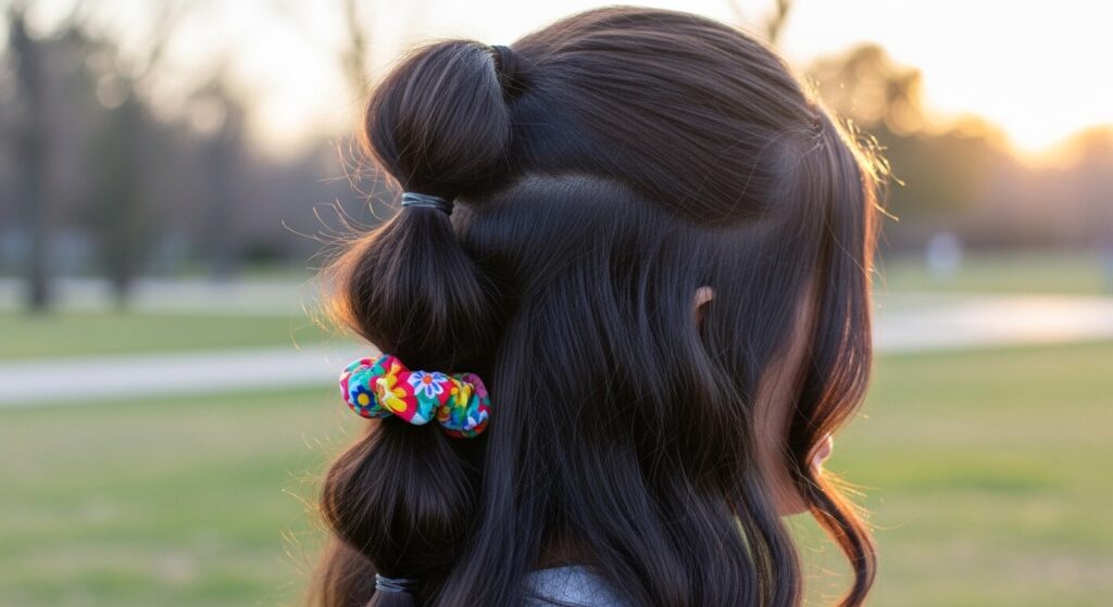 The Scrunchie Statement: Swap your basic hair tie for a large, luxurious silk scrunchie or a bold, printed one. The accessory becomes the focal point. Simply gather your half-ponytail and wrap the scrunchie around multiple times for a chic, ‘90s revival vibe.