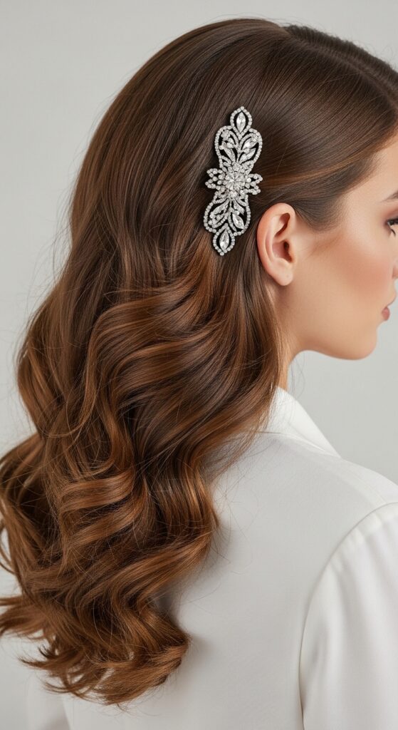 15. Side-Swept Curls with a Glitz Clip