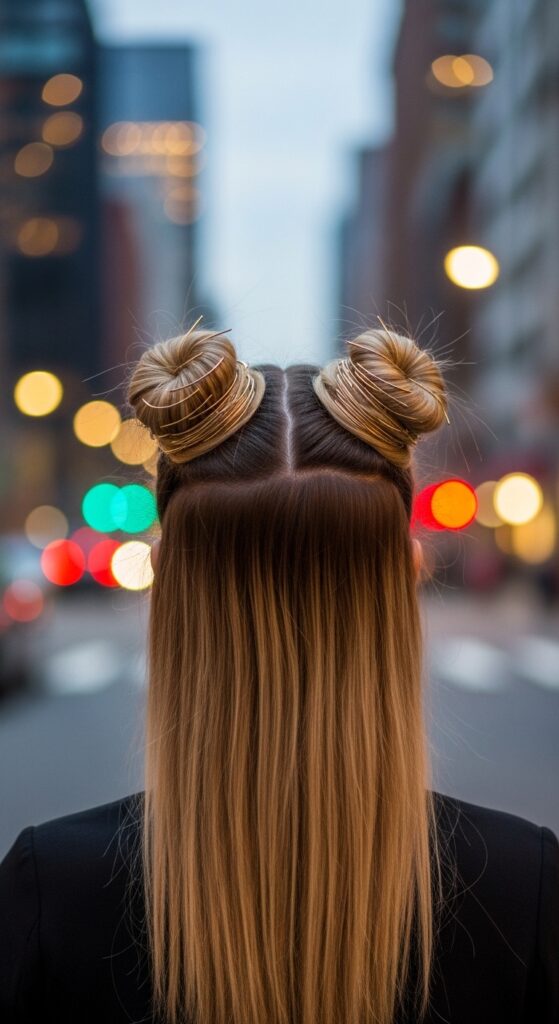 Part your hair down the middle. Create two high, sleek ponytails and twist each into a neat bun. Secure them tightly.