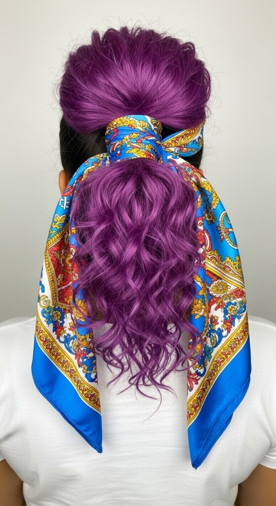 Create a mid-height ponytail with plenty of texture—tease the crown slightly for volume. Tie your scarf around the base of the ponytail, hiding the elastic.
