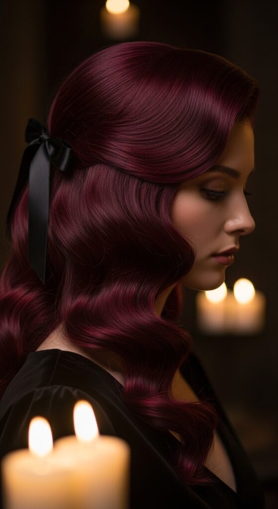 Moody, beautiful, and perfect for a winter evening. This take on romantic goth hairstyles is soft and wearable, not scary. It’s all about deep color and texture.