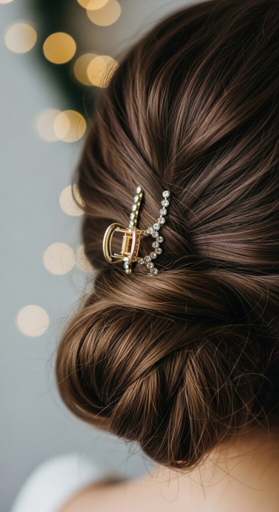 This is my go-to when I’m running late but still want to look polished. It takes the basic “messy bun” and makes it party-ready with one simple swap: a sparkly mini claw clip.