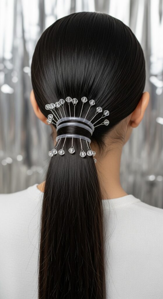 Now, take individual crystal hair pins and slide them vertically into the base of the ponytail, covering the elastic. It looks like your hair is held together by magic and jewels.