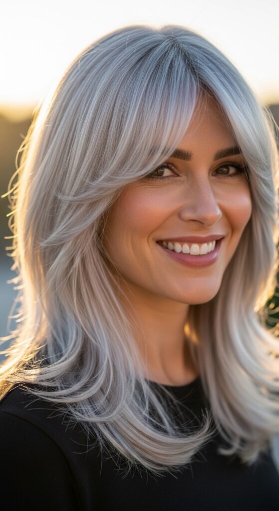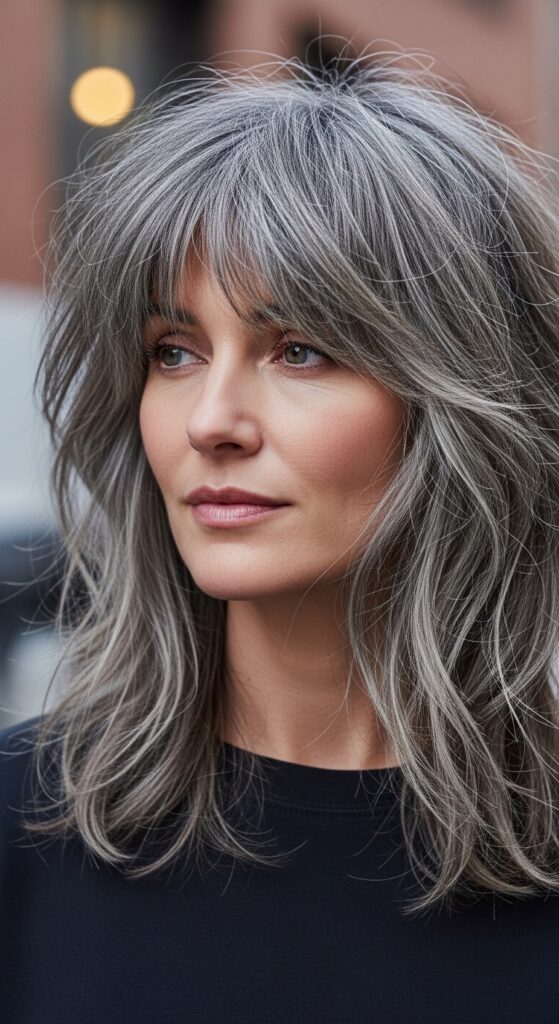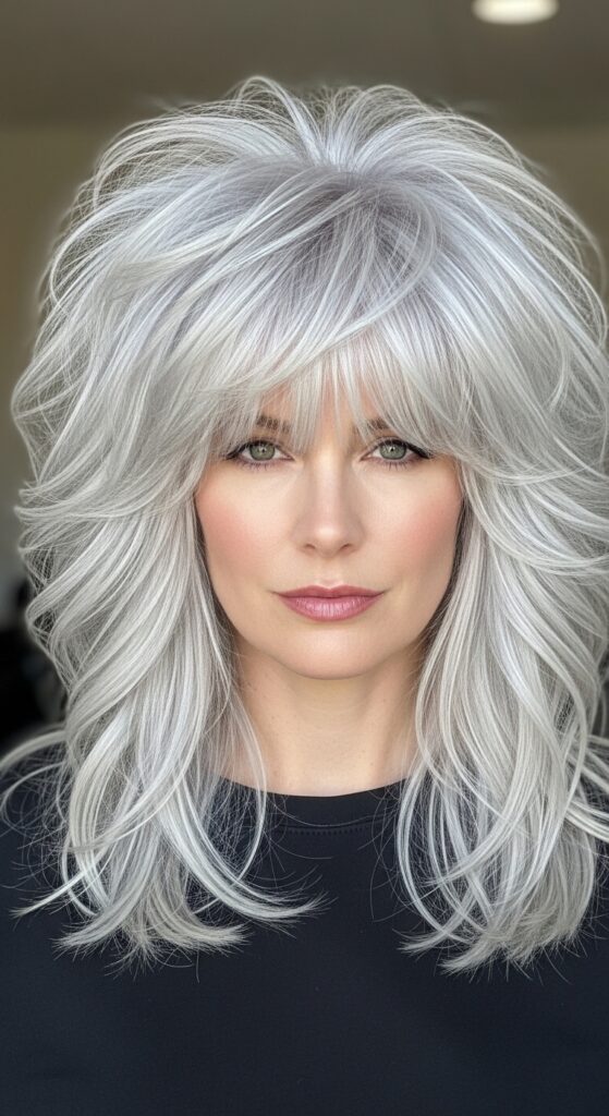 If you’re rocking silver or gray hair, lean into it with a cut that shows off the color’s dimension. A shag with plenty of layers catches the light on every strand, making your silver sparkle.