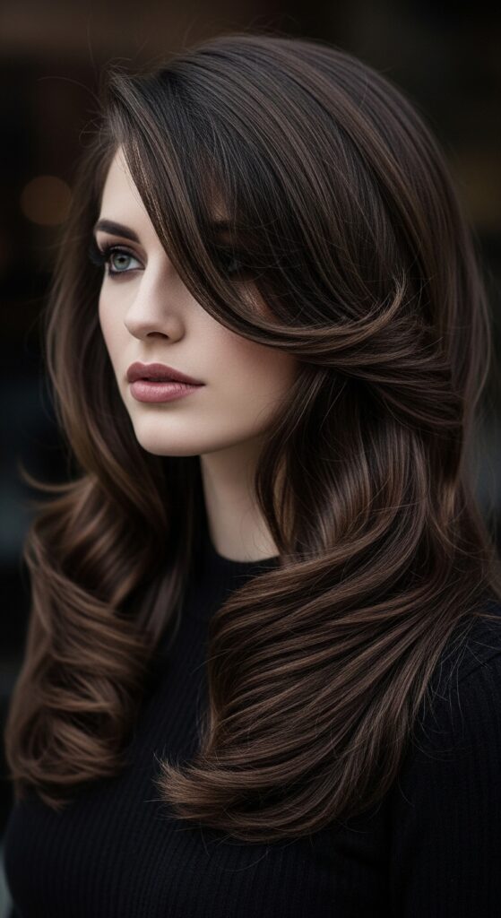It’s mysterious, romantic, and incredibly flattering. The deep part and long layers create a beautiful, cascading effect that feels both classic and cool.