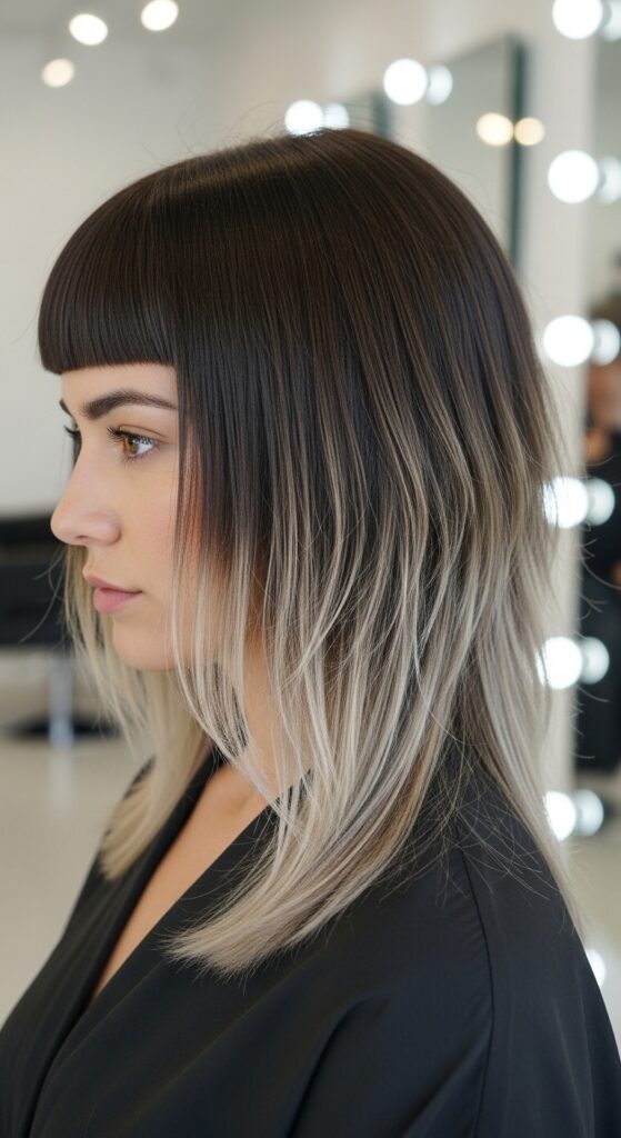 Think: keeping your length but adding a bold, blunt frame around your face starting at the chin or jaw. It’s a graphic, artistic look that makes a statement while still feeling elegant.