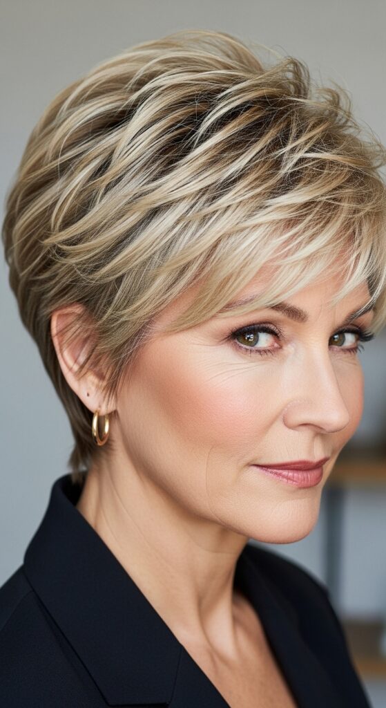 Short hair can be incredibly flattering and youthful. The key is in the details: longer, textured pieces around the hairline to frame your face, and plenty of volume at the crown.