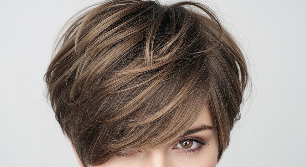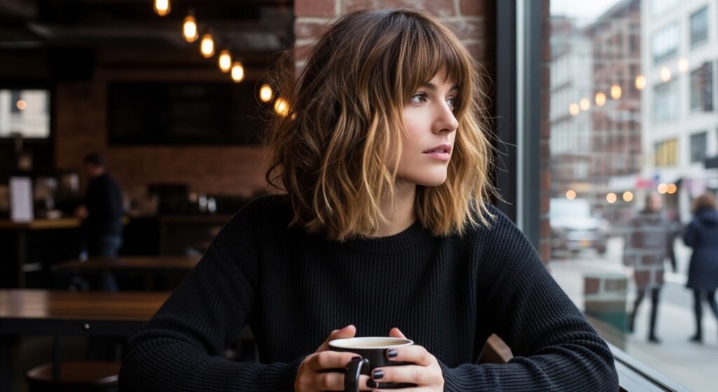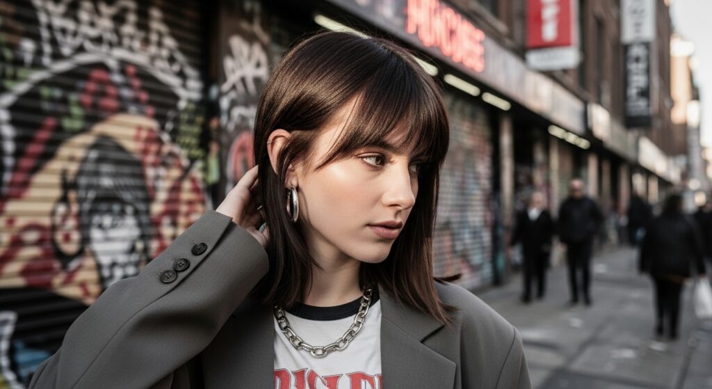 A wispy, fragmented fringe connects the shorter front to the longer back. It’s an edgy, artistic take on balance that’s full of personality.