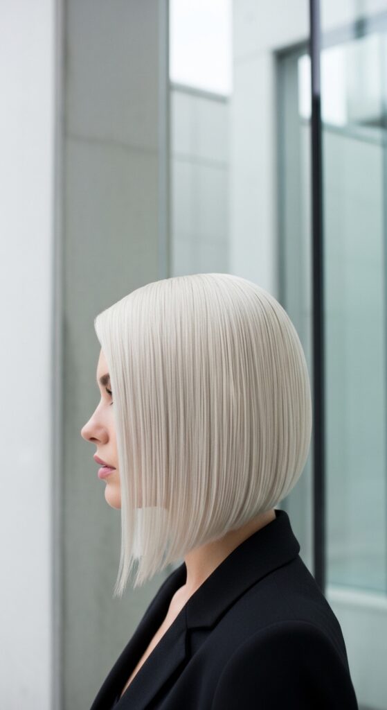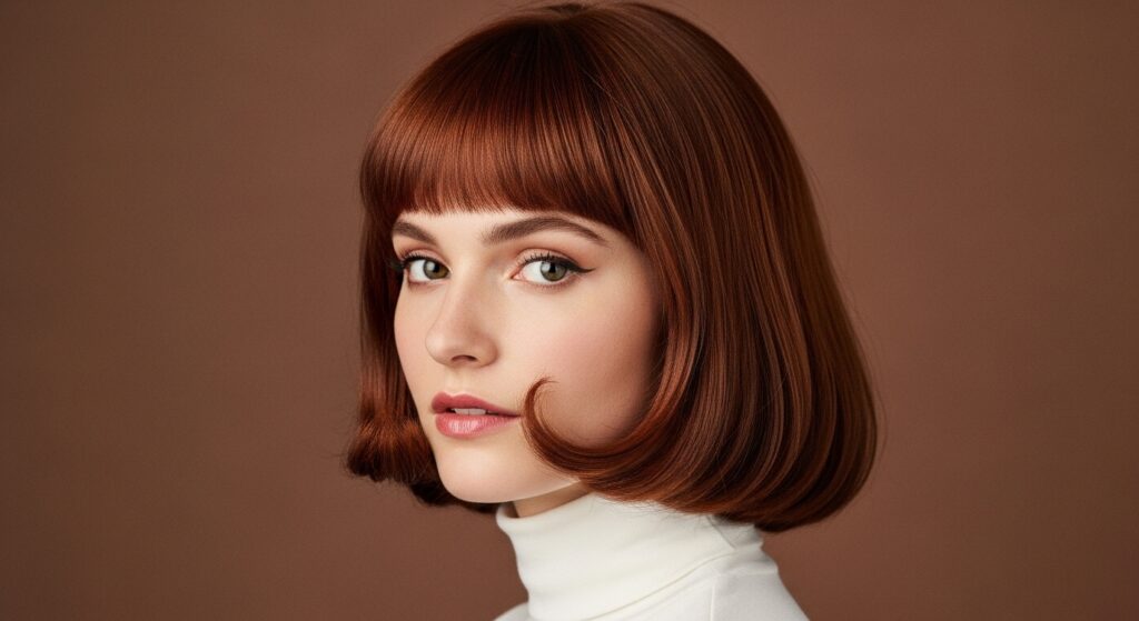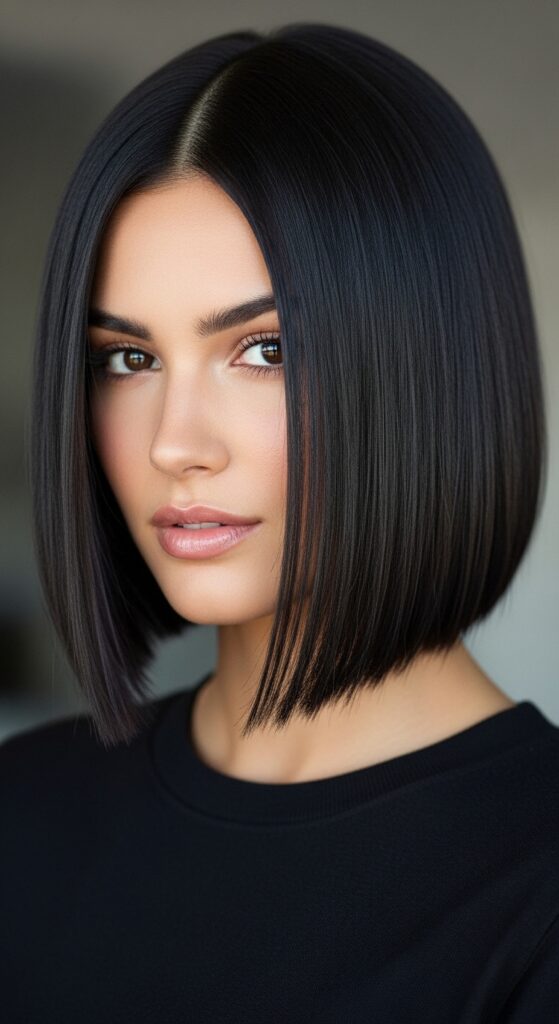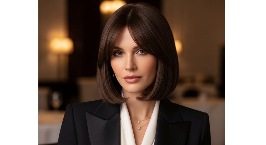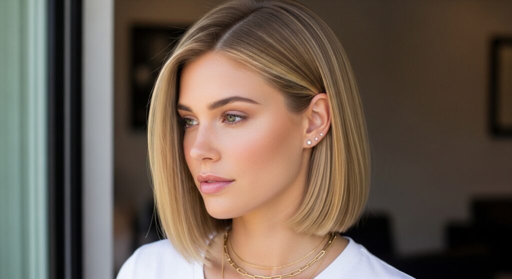 Think timeless, polished, and quietly expensive. The “old money hair” aesthetic is perfect for oblong faces when done right. A blunt cut at the collarbone has serious weight.
