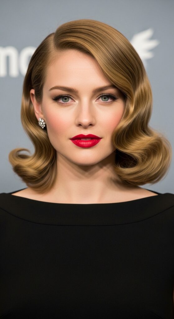 Smooth, sculpted waves that cascade over the shoulders widen your silhouette. A deep side part and pin-curled bangs complete the iconic look.