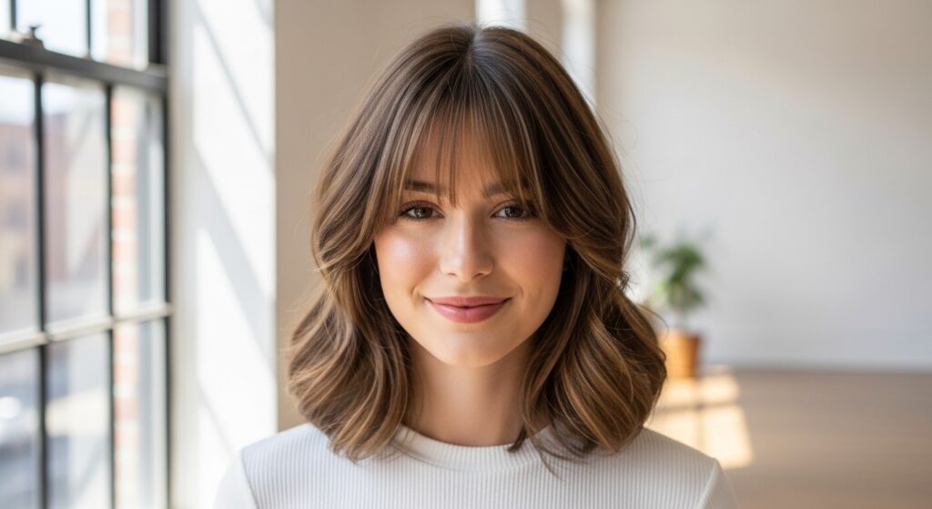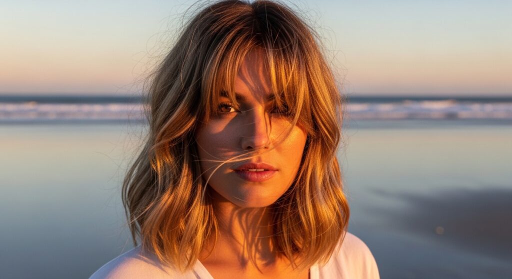 The goal is all about creating the illusion of width and shortening the face’s length. And guess what? Shoulder-length hair with waves and strategic bangs is basically your secret weapon. It’s the sweet spot.
