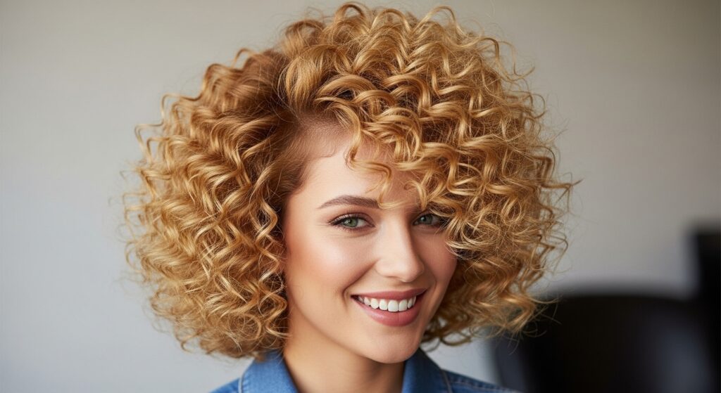 A deep side part allows the curls to cascade in a widening shape. Keep bangs as part of the curl pattern or opt for long, curly face-framing pieces.