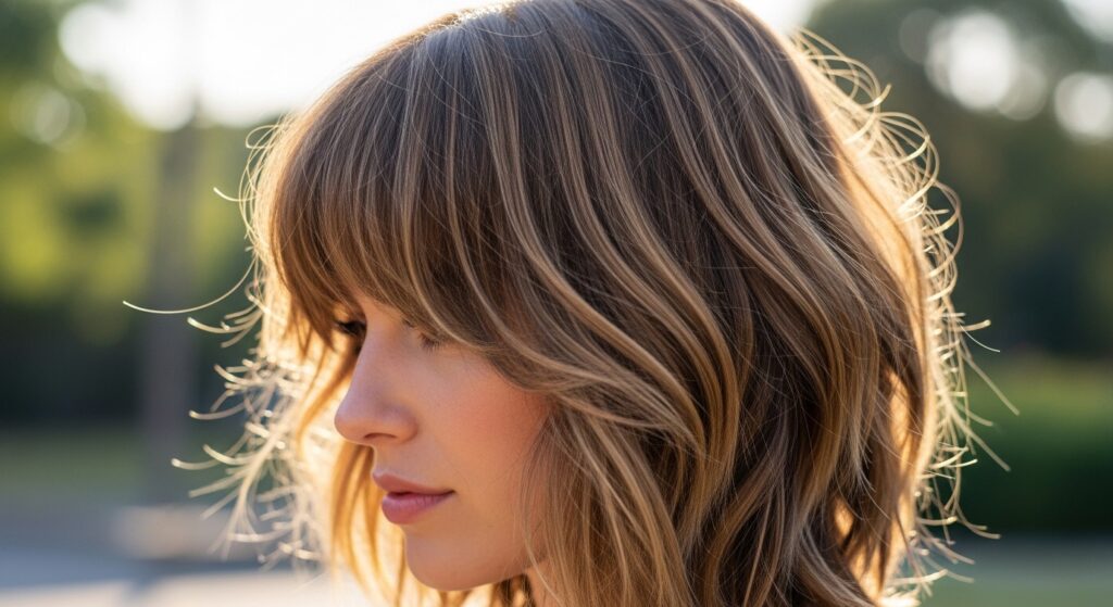 The waves add body at the sides, and the bangs softly shorten the forehead. It’s a low-maintenance, high-impact style that feels fresh and sunny.