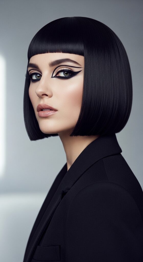 Feeling bold? A sharp, blunt shoulder-length cut paired with micro bangs is a fierce and fashion-forward choice.
