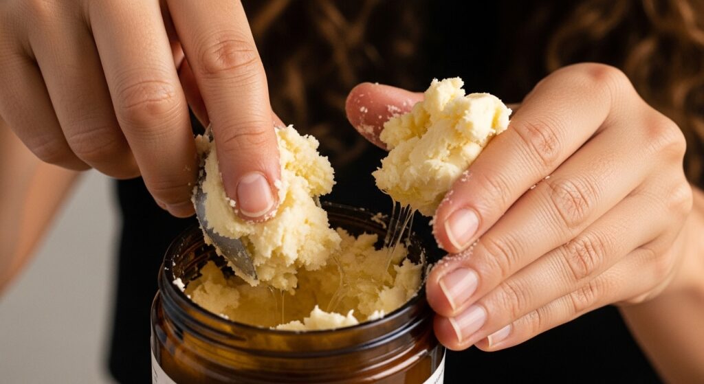 7. Shea Butter Melt: Melt a small amount of raw shea butter between your palms and work it through damp hair. Its thick consistency is a savior for thick, coily hair types.