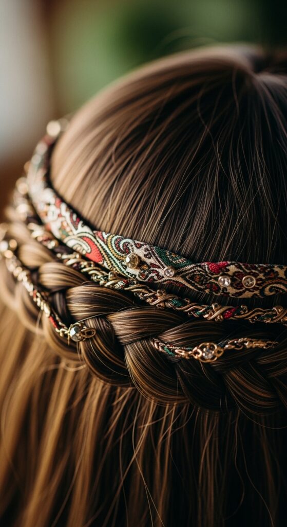 This is a delicate alternative to heavy hair jewelry. It gives you that festival glam without the weight. You can use a skinny scarf or even a repurposed ribbon for this. It’s surprisingly simple but looks intricate.