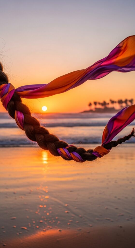 For my long-haired friends, this is a dreamy festival or beach look. The scarf becomes part of the braid at the end, flowing like a mermaid or fairy tail. It’s pure boho magic.