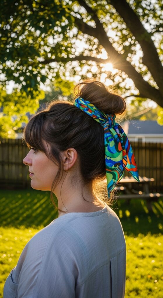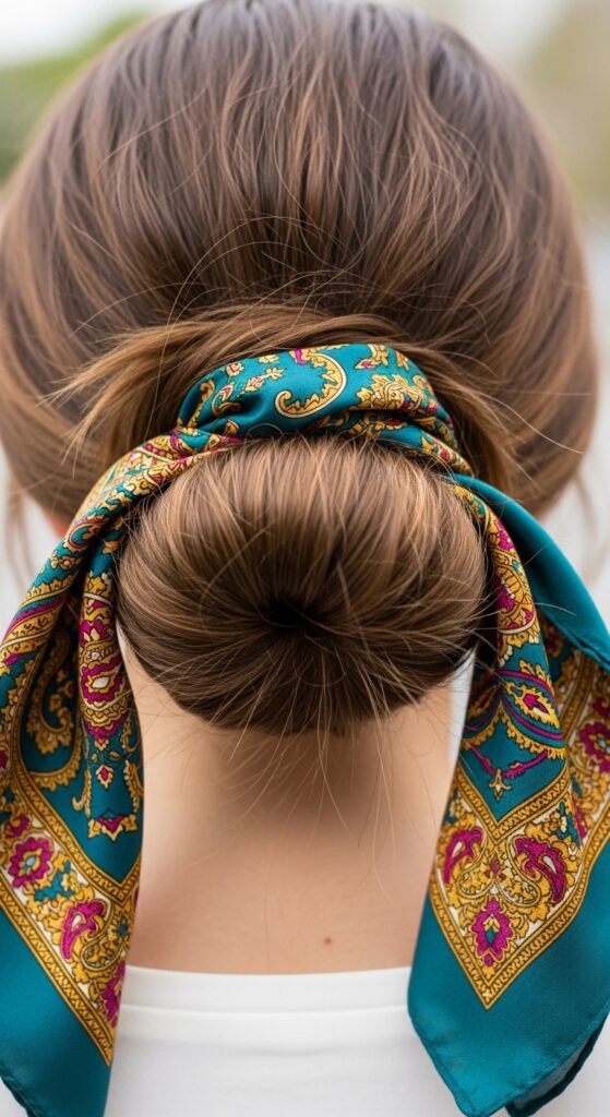 4. Wrap the ends around the base of the bun and tie a secure knot or a cute bow. Fluff the bun and scarf for that perfect undone feel.