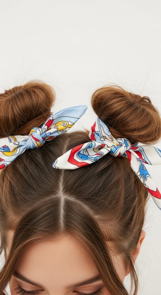 Create two high pigtails and twist them into buns. Take two small square scarves and fold them into thin bands. Tie each one around the base of a bun, making a small knot or bow. Let the ends stick out for a cute, quirky effect. Perfect with glitter and sunglasses!