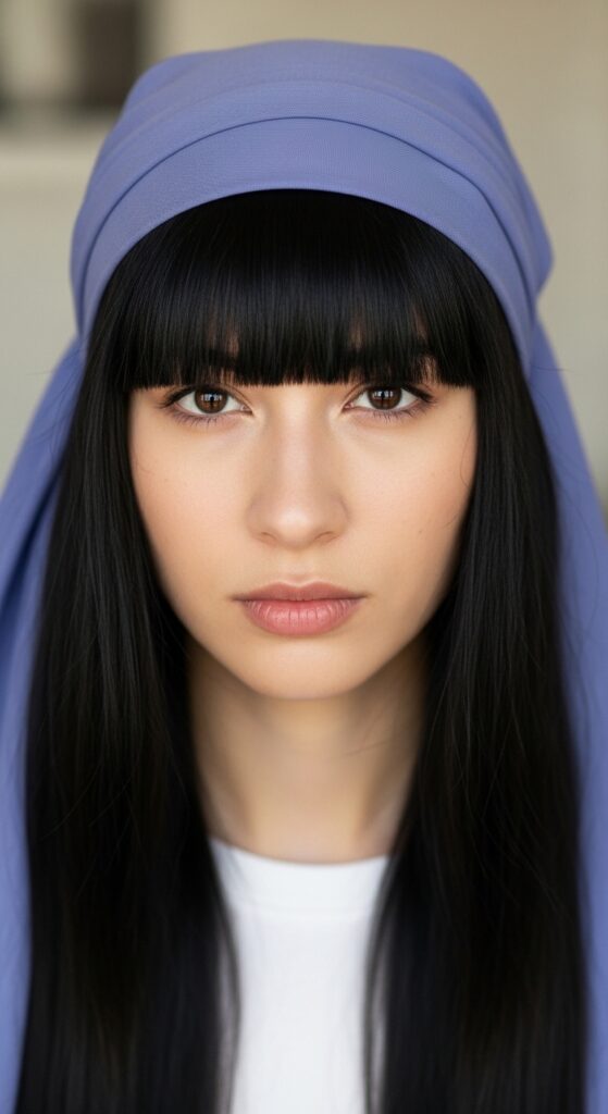 Choose a scarf with a strong, straight edge. When you do a full headwrap or a pirate-style tie, make sure that front edge is perfectly straight and sits right above your eyebrows. It creates the illusion of severe, beautiful bangs. Pair it with straight hair for maximum impact.
