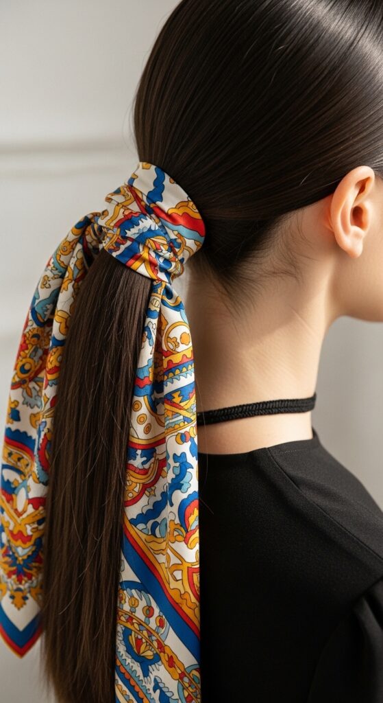 This turns a basic ponytail into a stylish, textured masterpiece. The wrapping hides the hair tie, and twisting the scarf into the hair adds length and interest. It’s sporty and chic.