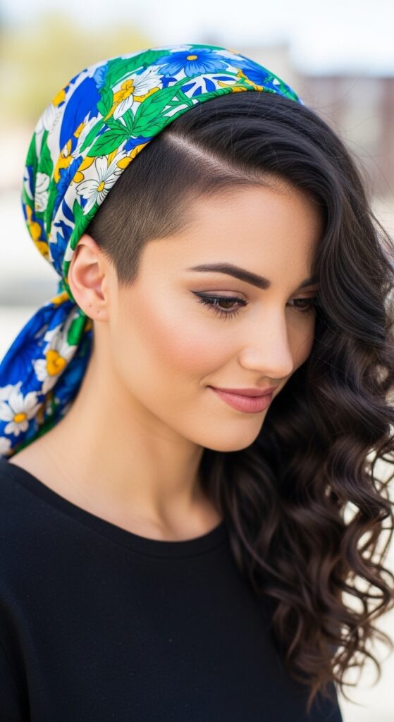 Love the drama of an asymmetrical lob? You can create that vibe with a scarf. This style is artistic, bold, and perfect for making a statement. It draws attention to your eyes and cheekbones.