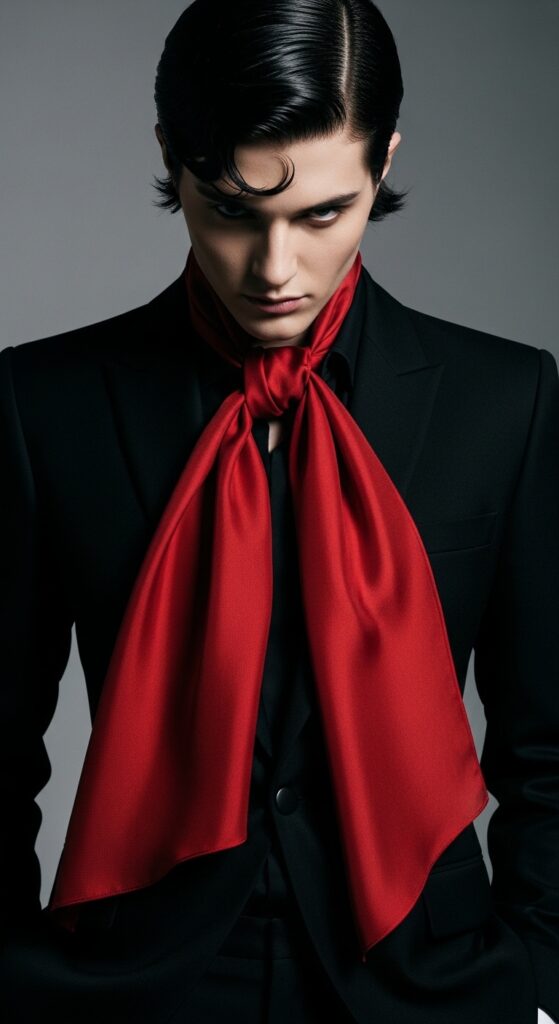 Channel those romantic goth hairstyles or vampire haircut aesthetics with this accessory trick. It’s less about the hair and more about the vibe. A scarf at the neck adds a touch of aristocratic, “old money” drama.