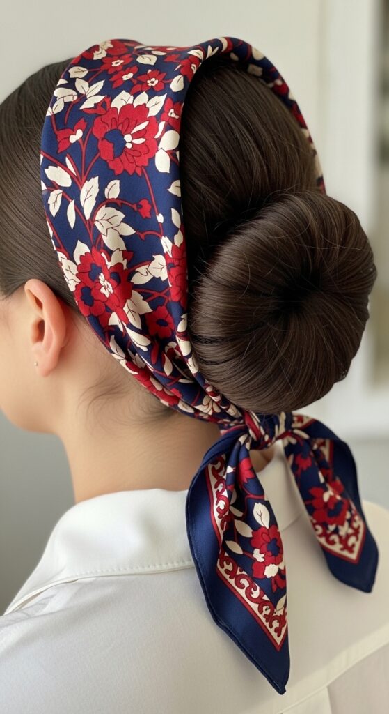 Make a low, loose bun with a hair tie. Fold a scarf into a long, thin rope. Slide one end under the hair tie and pull it most of the way through, so you have a loop on one side and two ends on the other. Gently tug to adjust. It looks complicated but is so easy.
