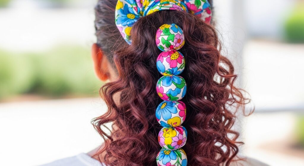 This playful trend has ’90s roots with a 2020s update. After securing your ponytail with a scrunchie (choose a thin one to start), use additional small elastics or even more mini scrunchies down the length of the tail. Gently puff out the sections between the ties to create “bubbles.” The scrunchie at the base adds that signature nostalgic touch and a pop of color or texture. It’s a fun, eye-catching style perfect for festivals, parties, or just adding some whimsy to your day.